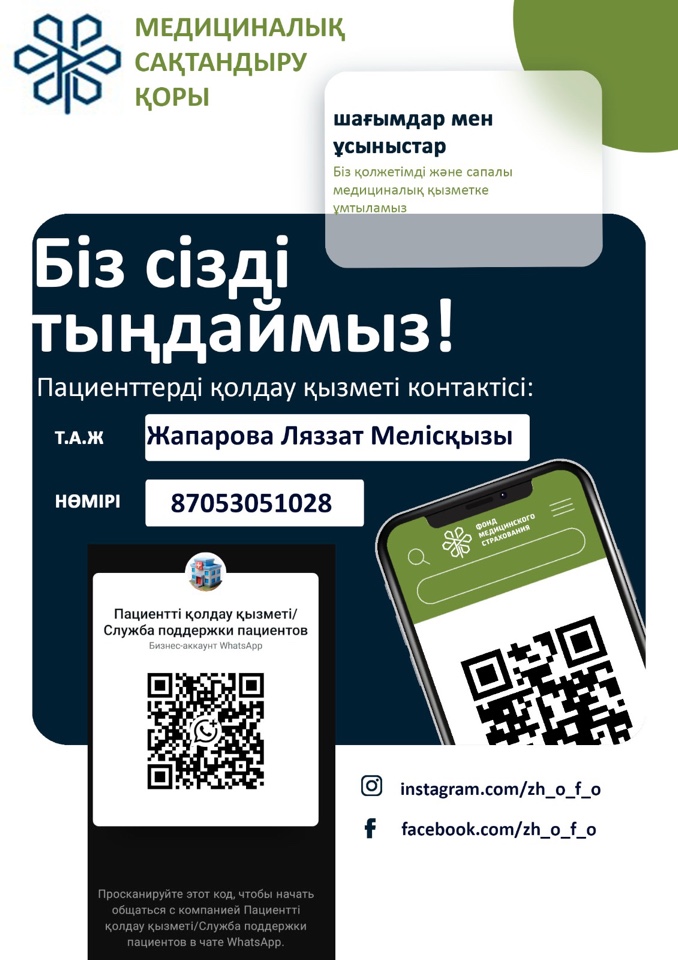 Жамбыл облыстық фтизиопульмонология орталығы “Пациенттерге қолдау көрсету қызметінің”  QR  коды мен байланыс телефоны.